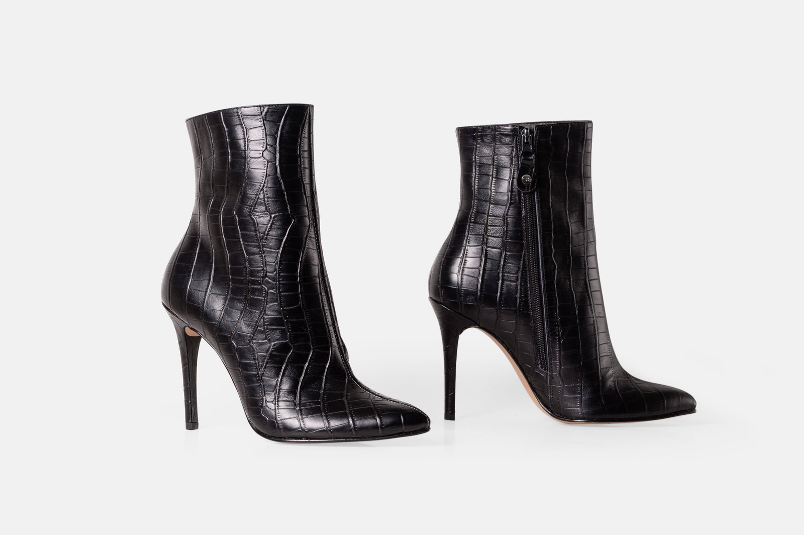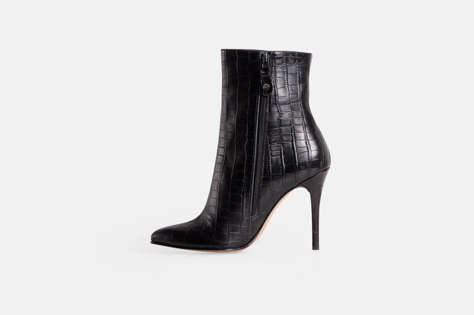 Estos botines de mujer con taco alto tienen algo magnético cuando se visten de negro profundo. El grabado croco, al bañarse este tono oscuro, deja de ser solo una textura para convertirse en un juego de luces y sombras que desprende una elegancia casi arquitectónica.