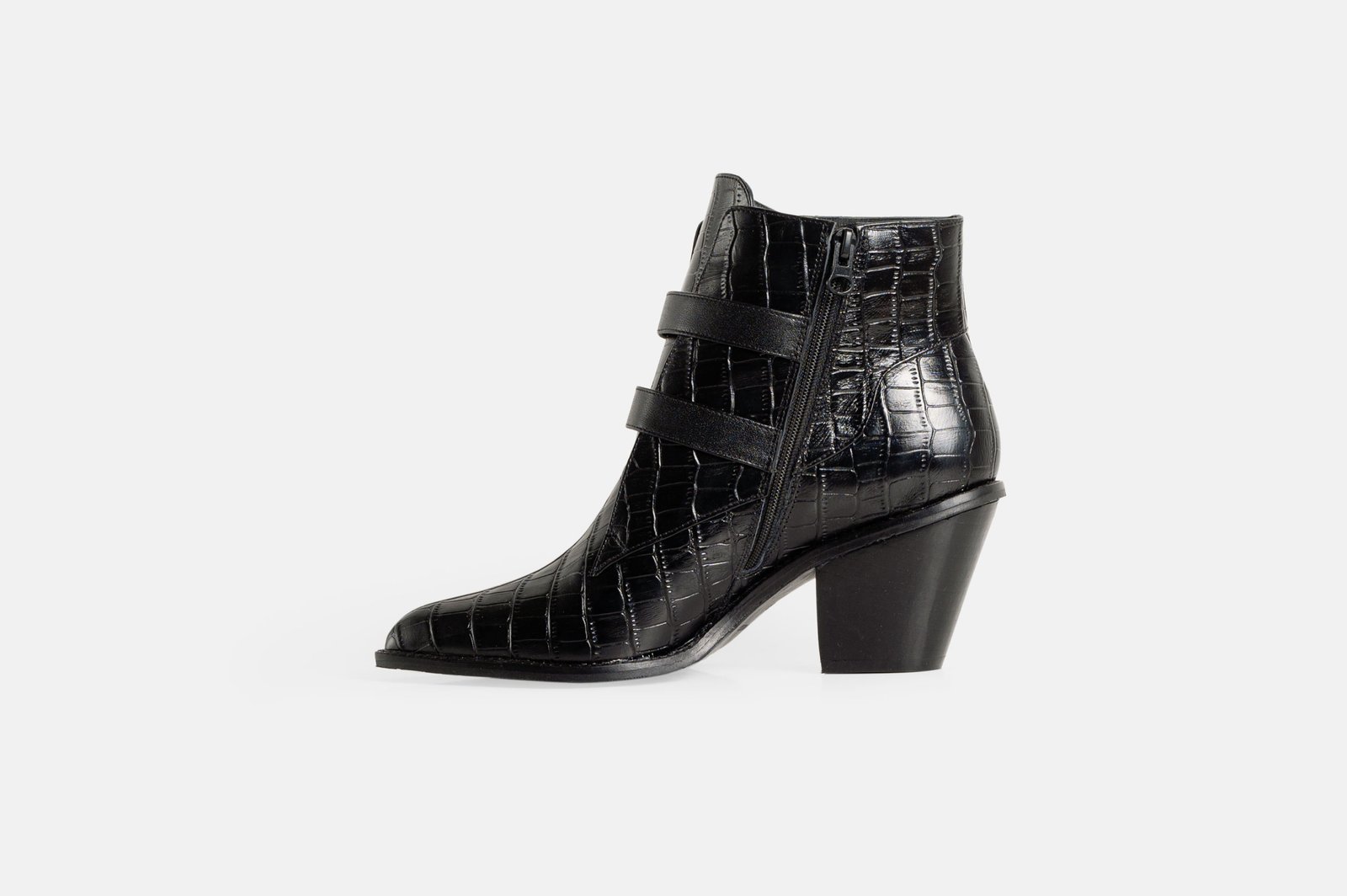 Botines para damas en cuero negro, son de origen bovino de primera selección con acabado croco de tacto sutil. Incorporan propiedades higroscópicas para el control de humedad y una suela con coeficiente de fricción optimizado. Construcción de alta estabilidad dimensional y pespunte reforzado para mayor durabilidad.