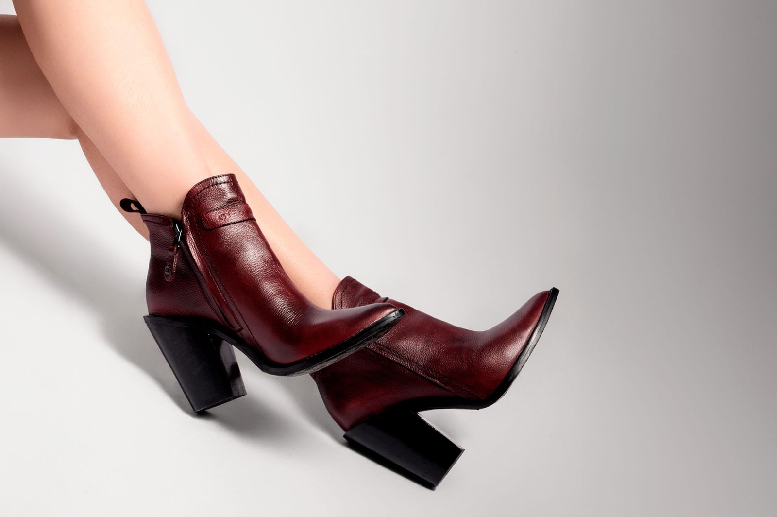 Botín de mujer BTEX 23, elaborado en cuero Crust color vino. Incorpora un piso de caucho resistente para mayor durabilidad. El forro interno combina cuero badana y tela afelpada, mientras que la plantilla es de cuero badana, ofreciendo confort superior. Diseño con tacón ancho y presilla. Un botín de cuero de alta calidad.