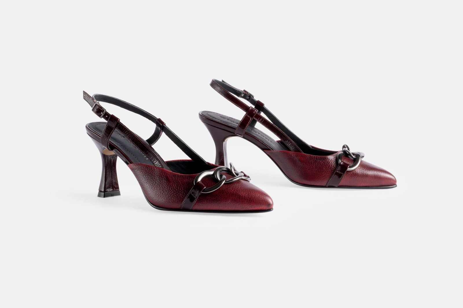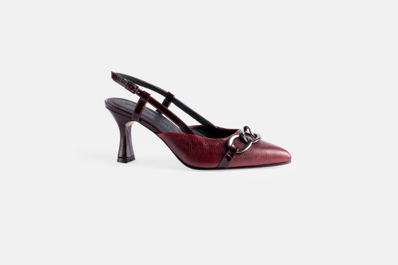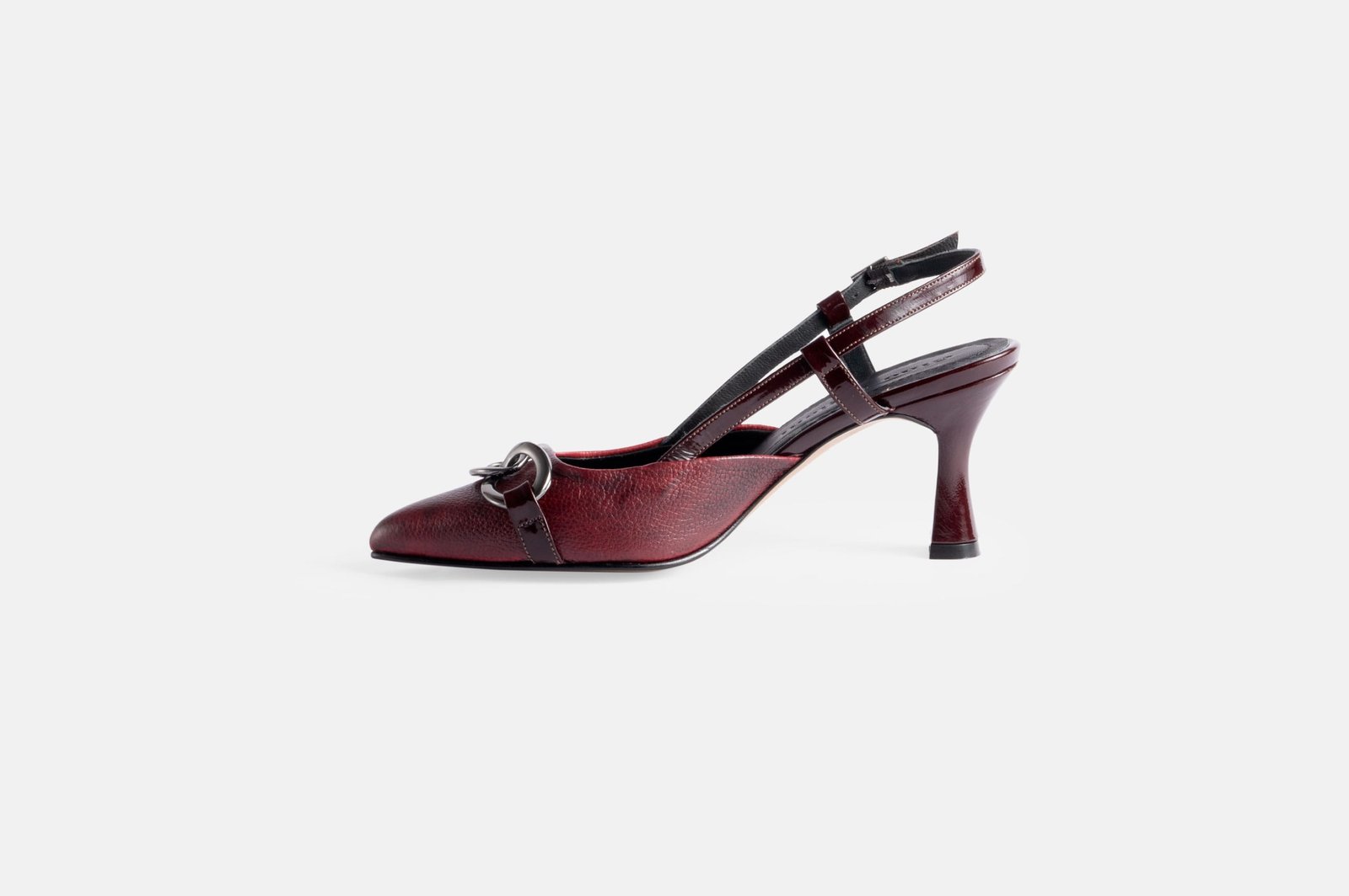 Exclusivo zapato de tacón tipo slingback en un deslumbrante color vino. Pensado en la mujer hicimos un acabado en cuero flotter y la distintiva hebilla frontal añaden un toque de glamour en tu caminar, haciéndolos perfectos para una jornada en la oficina con un traje sastre o para brillar en un evento especial con tu vestido favorito.