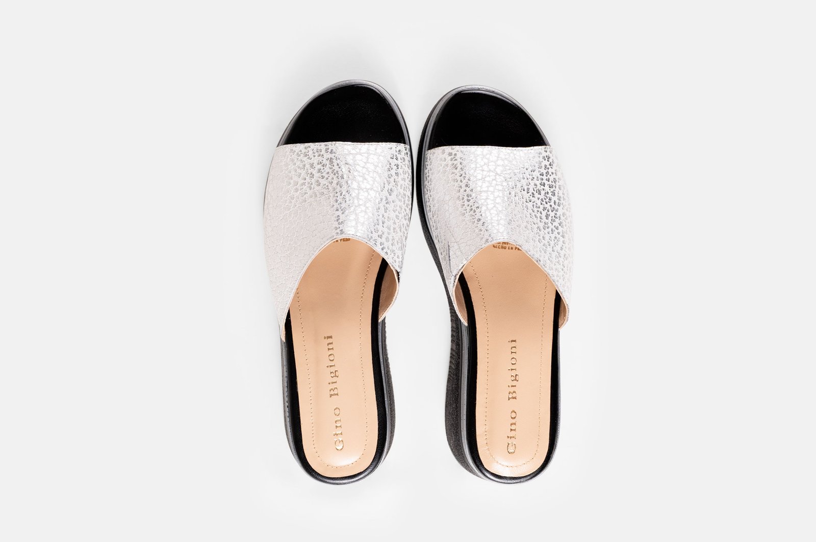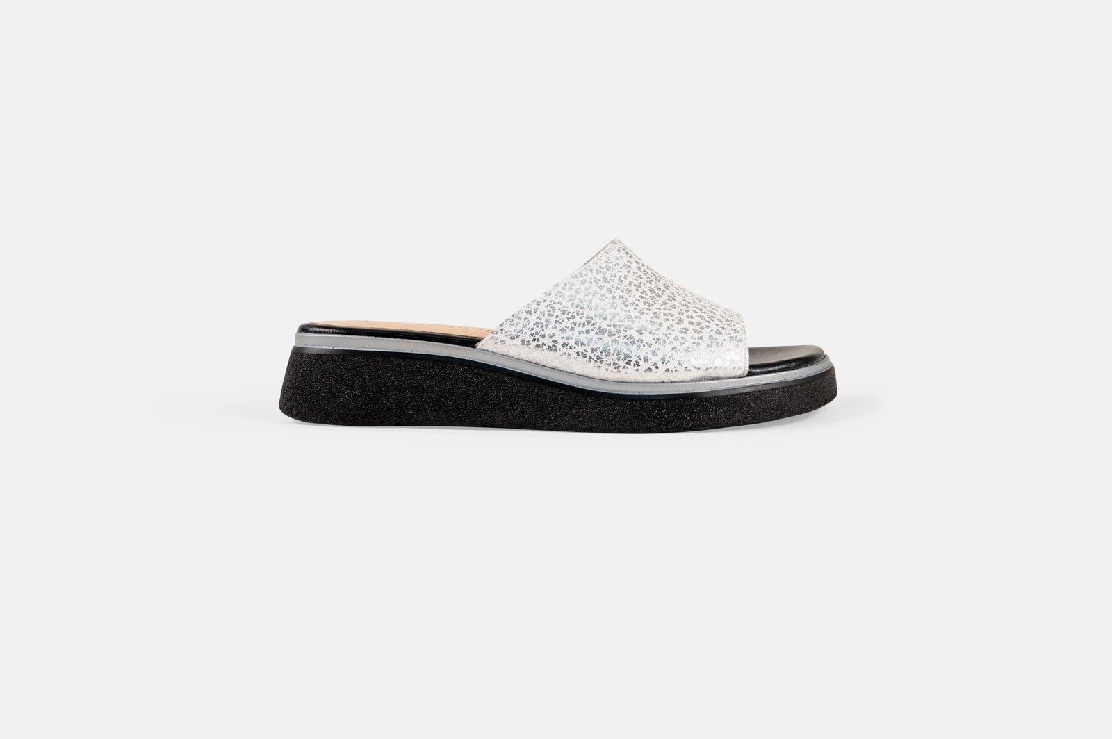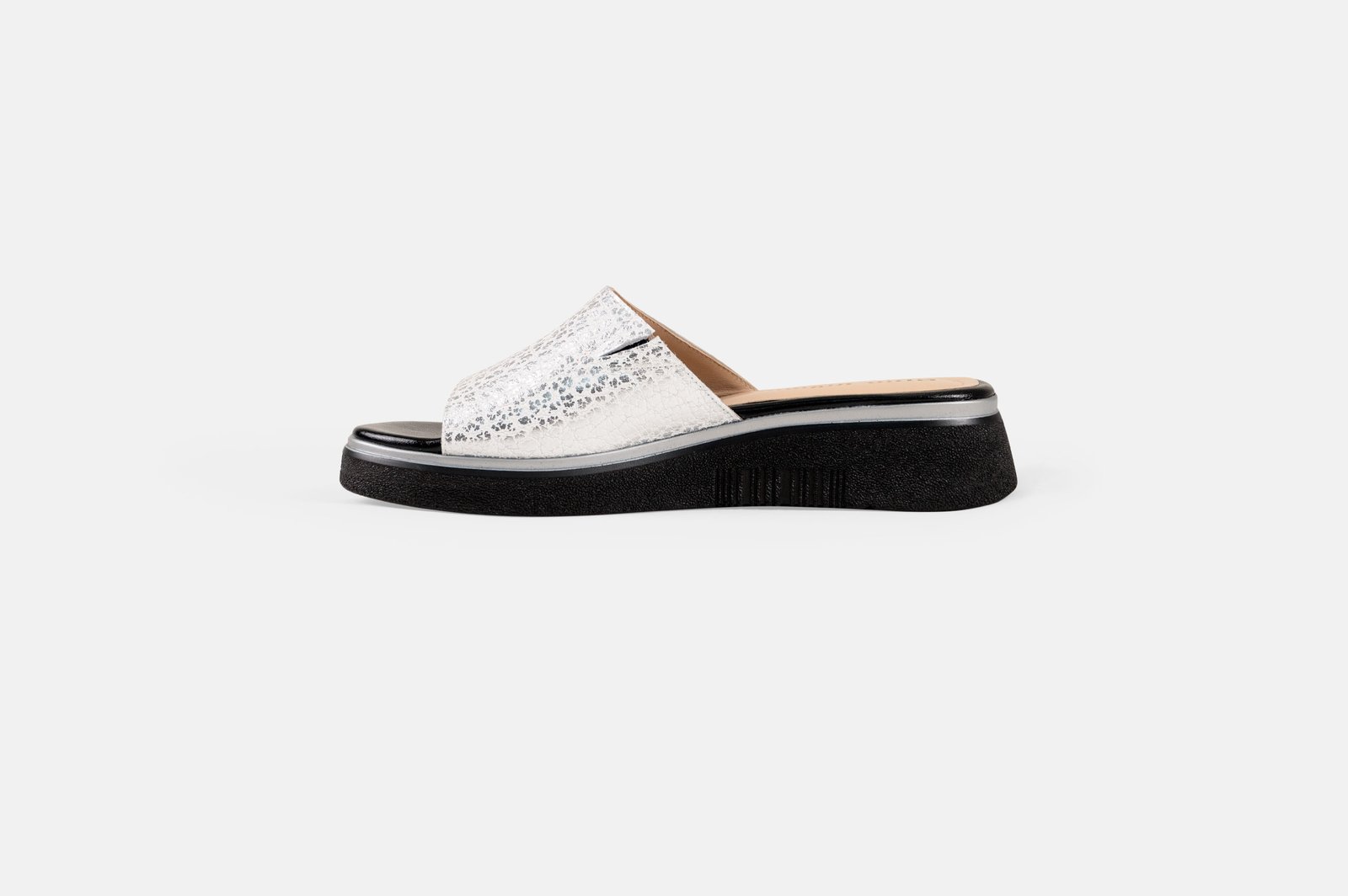 Esta sandalia plana de mujer esta fabricada en cuero genuino folia con textura craquelada en tonos blanco metalizado. Esta sandalia baja tiene una suela sintética negra antideslizante con plataforma corrida de 3 cm y detalle de vivo metalizado. Interior forrado y plantilla suave diseñados para brindar máximo confort diario