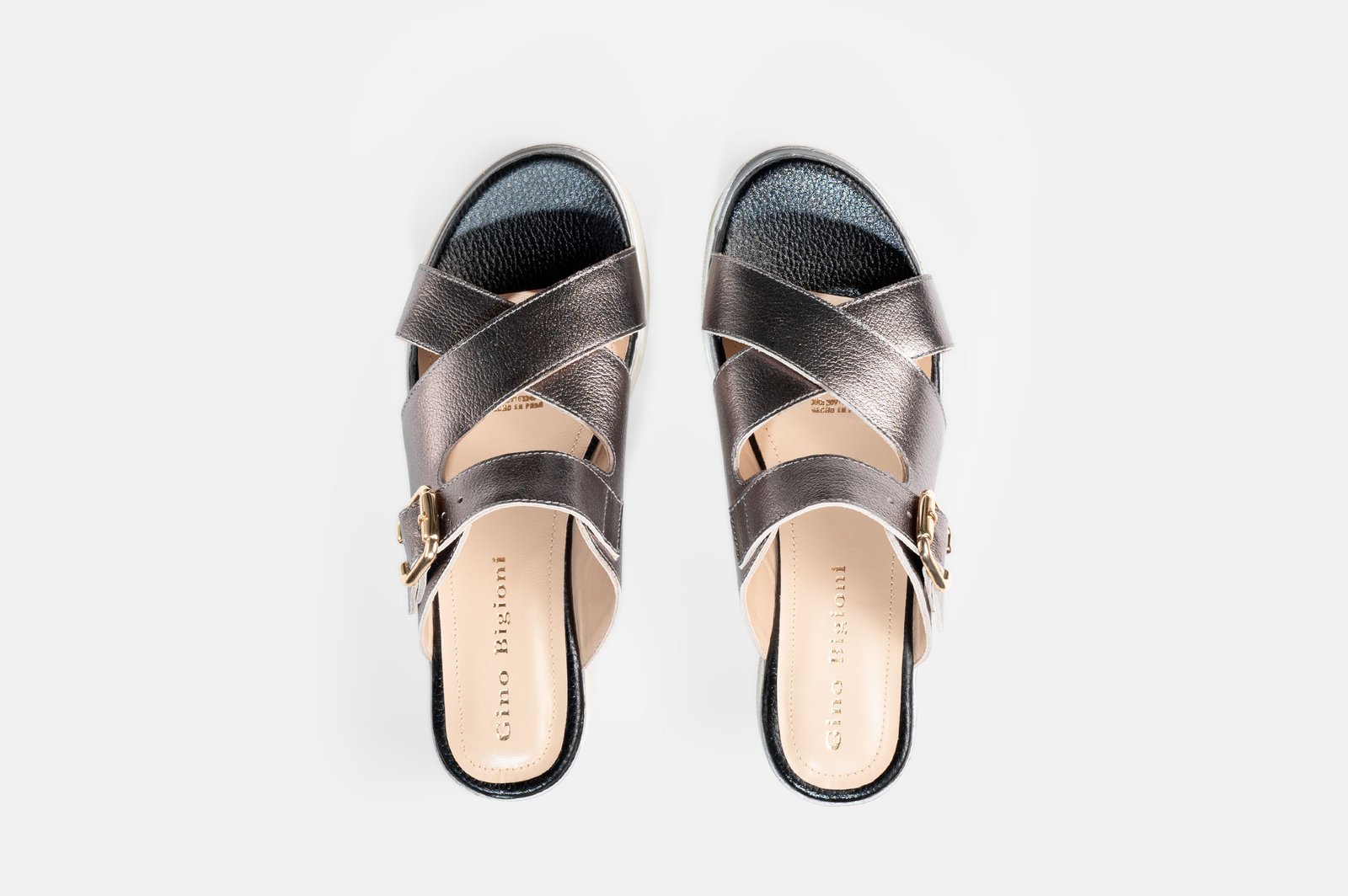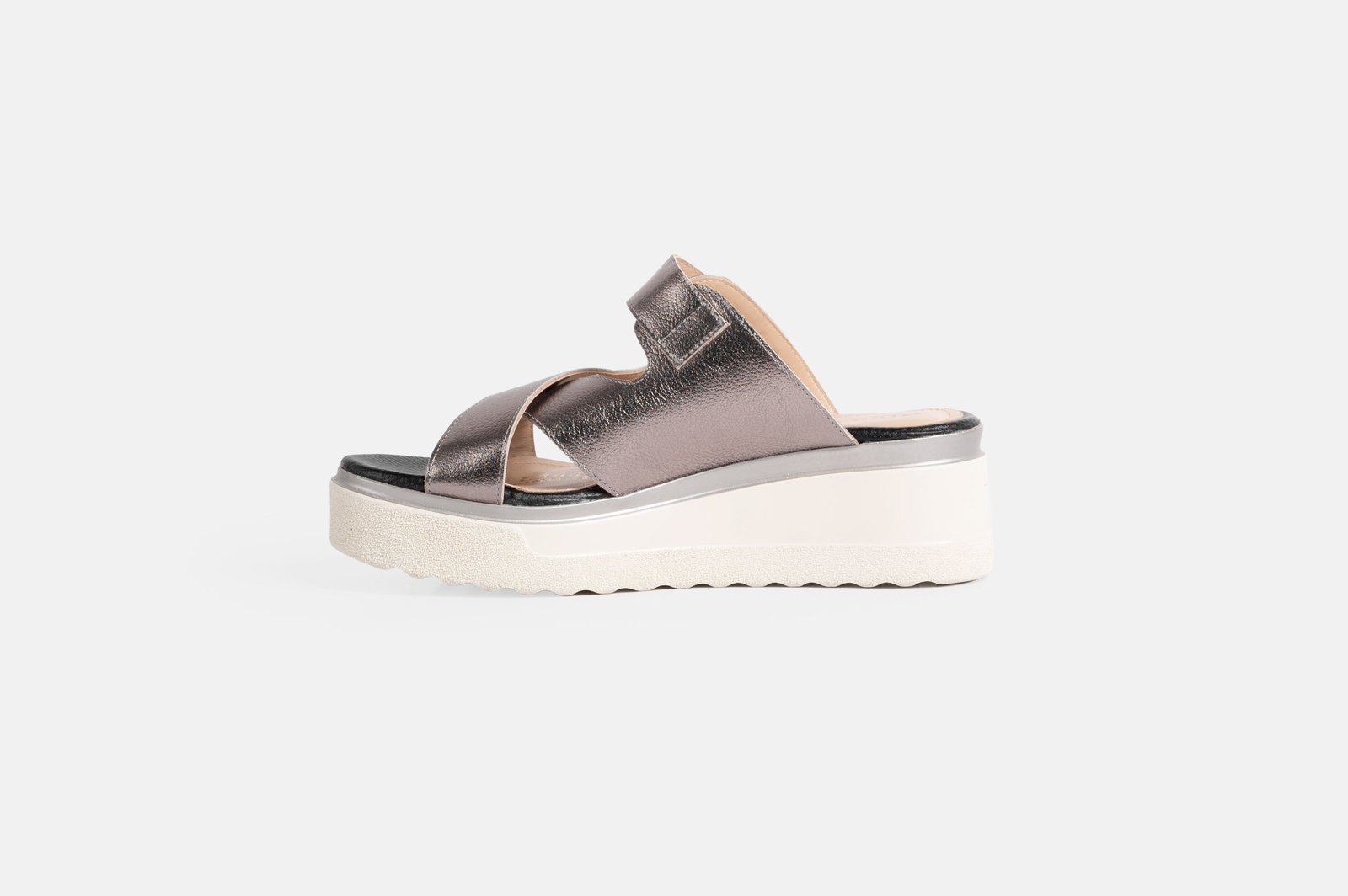 Sandalia casual de mujer realizada en cuero flotter color metalizado. Presenta un diseño de correas cruzadas con hebilla ajustable. Cuenta con una altura de talón de 5 cm y una plataforma delantera de 3 cm, garantizando estabilidad y un caminar ergonómico.