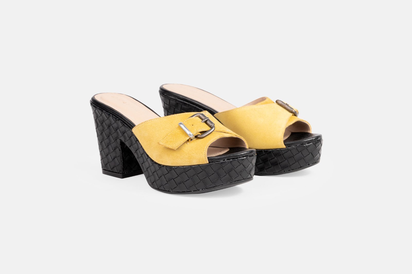 Estos zuecos de mujer que fusionan la calidez del sol con un diseño vanguardista. Confeccionados en cuero gamuzón de un vibrante tono amarillo, este calzado es la pieza clave para la mujer moderna que busca un equilibrio entre la audacia de la oficina y la comodidad del hogar. Su detalle de hebilla metálica sobre el empeine y el contraste con la plataforma oscura de textura trenzada aportan un aire artesanal y chic que no pasa desapercibido.