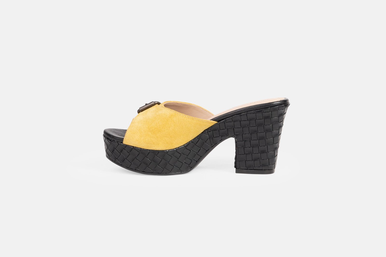 Zuecos de mujer modelo HAR-SAND elaborados en cuero gamuzón premium color amarillo. Cuentan con un taco de 9 cm y plataforma robusta con grabado táctil. Diseño de puntera abierta, hebilla ajustable decorativa y plantilla acolchada para un confort superior.