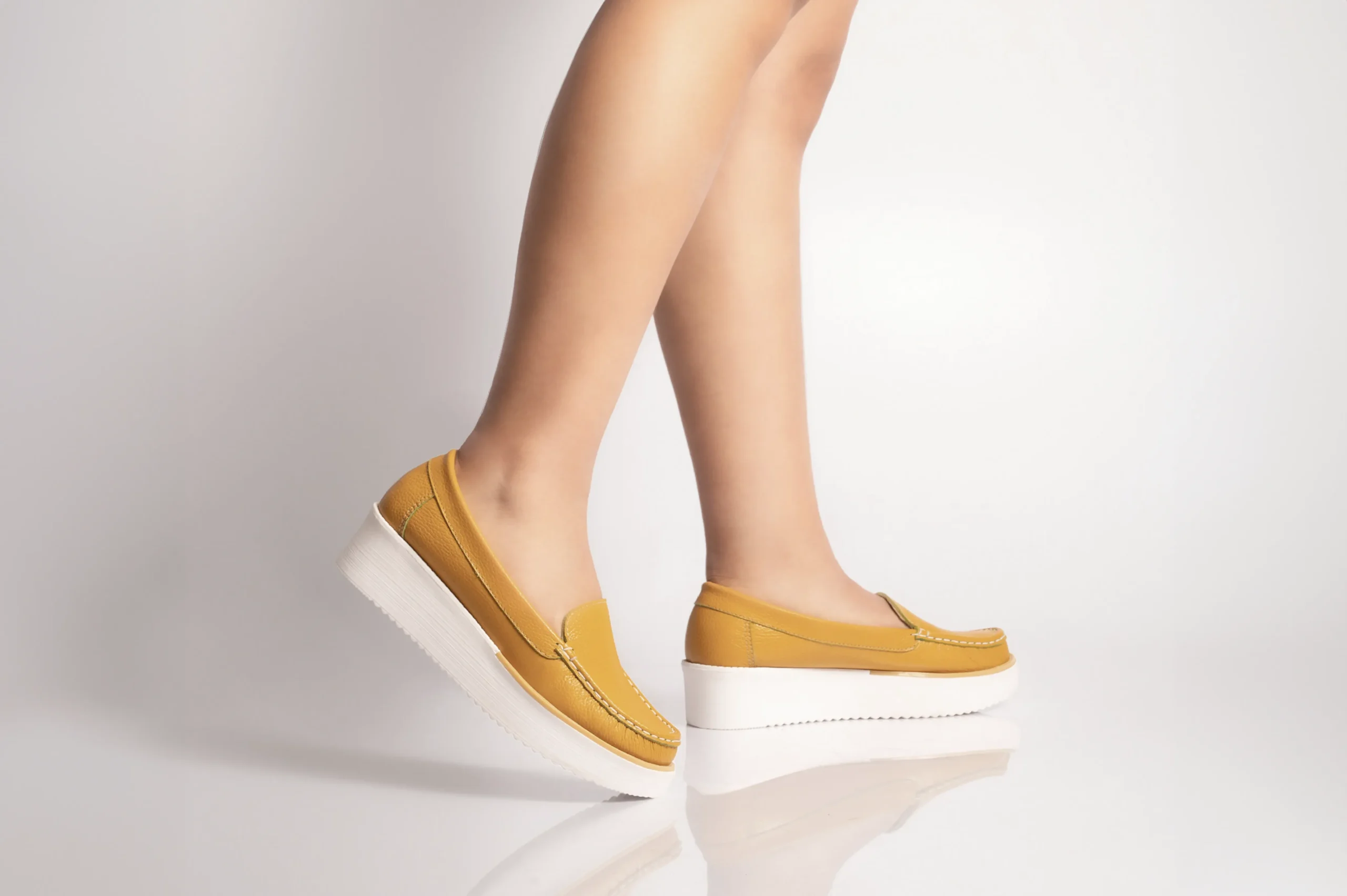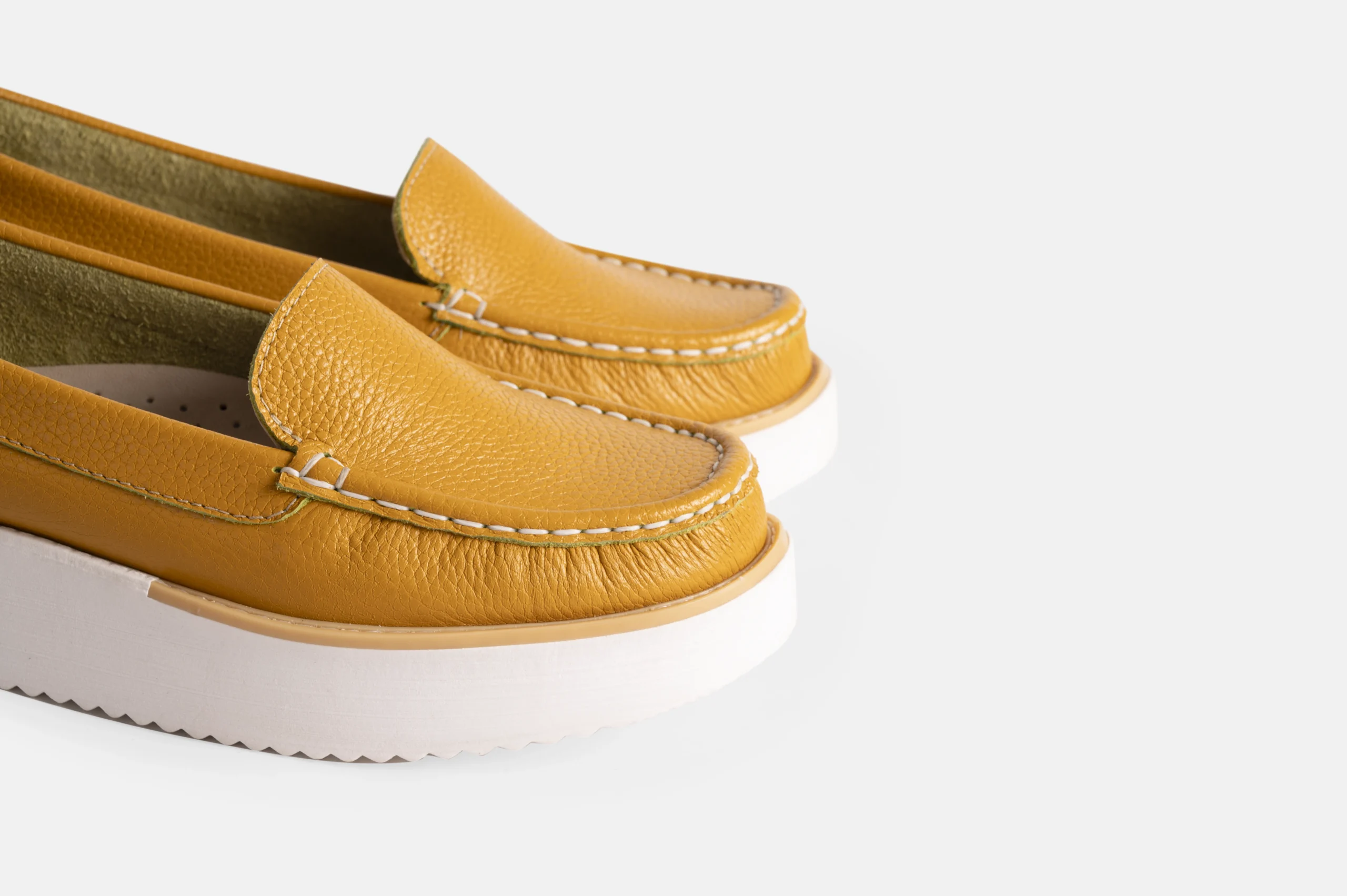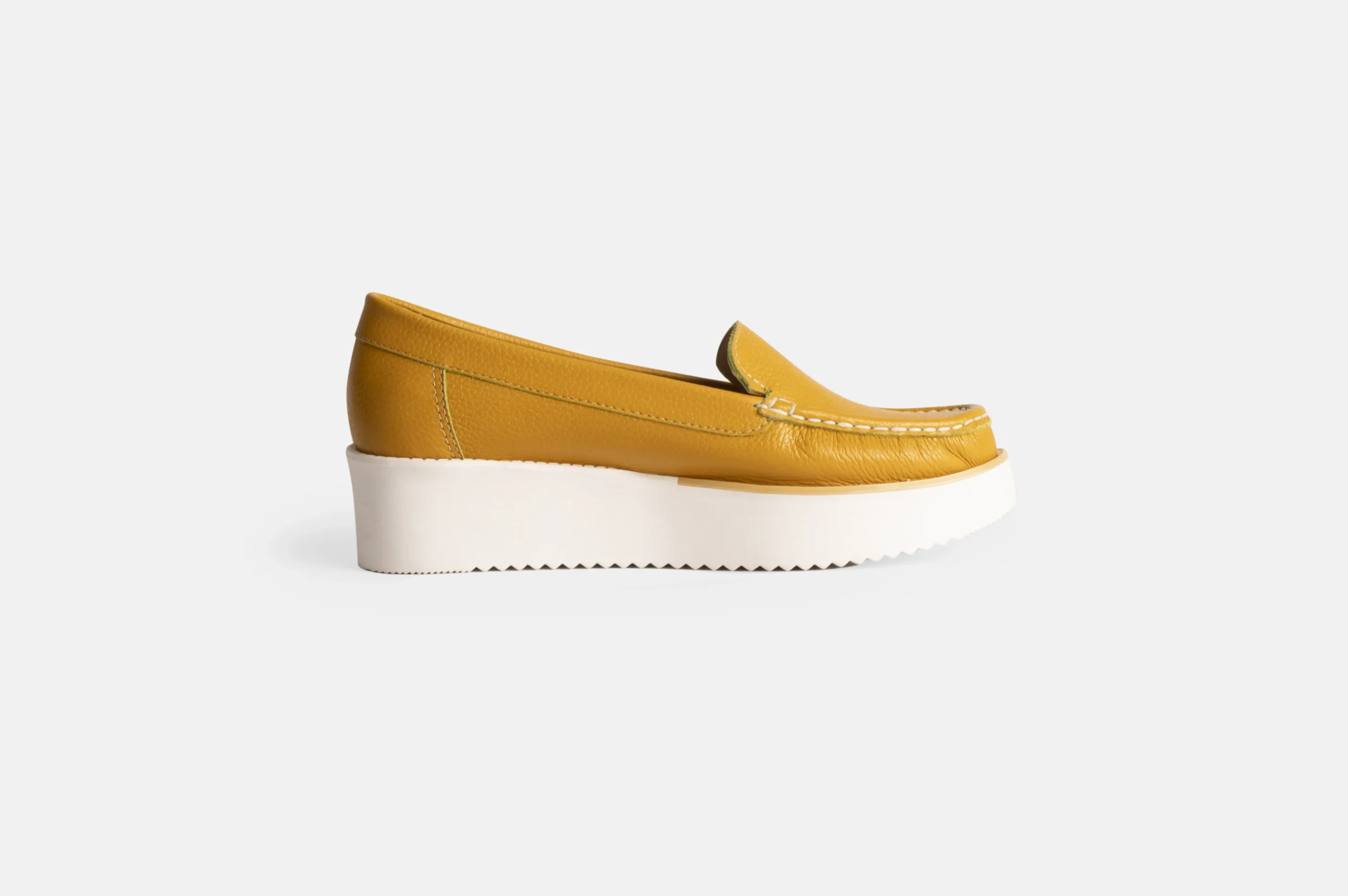 Mocasin para mujer color mostaza hechos en cuero genuino.