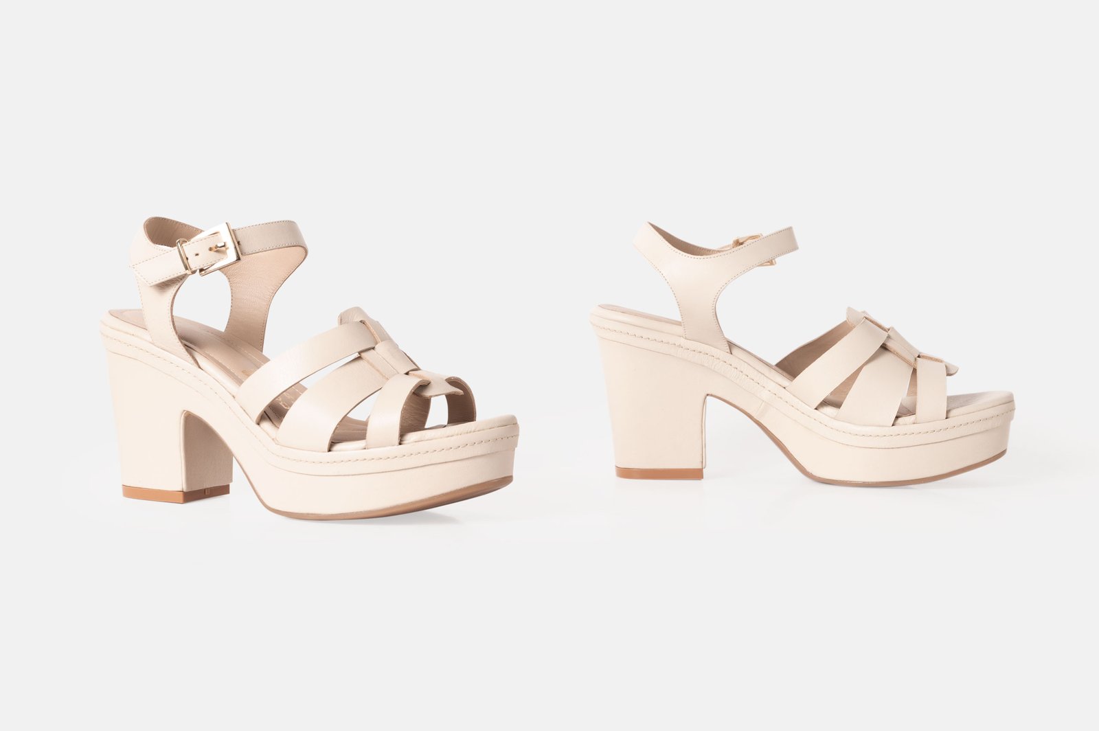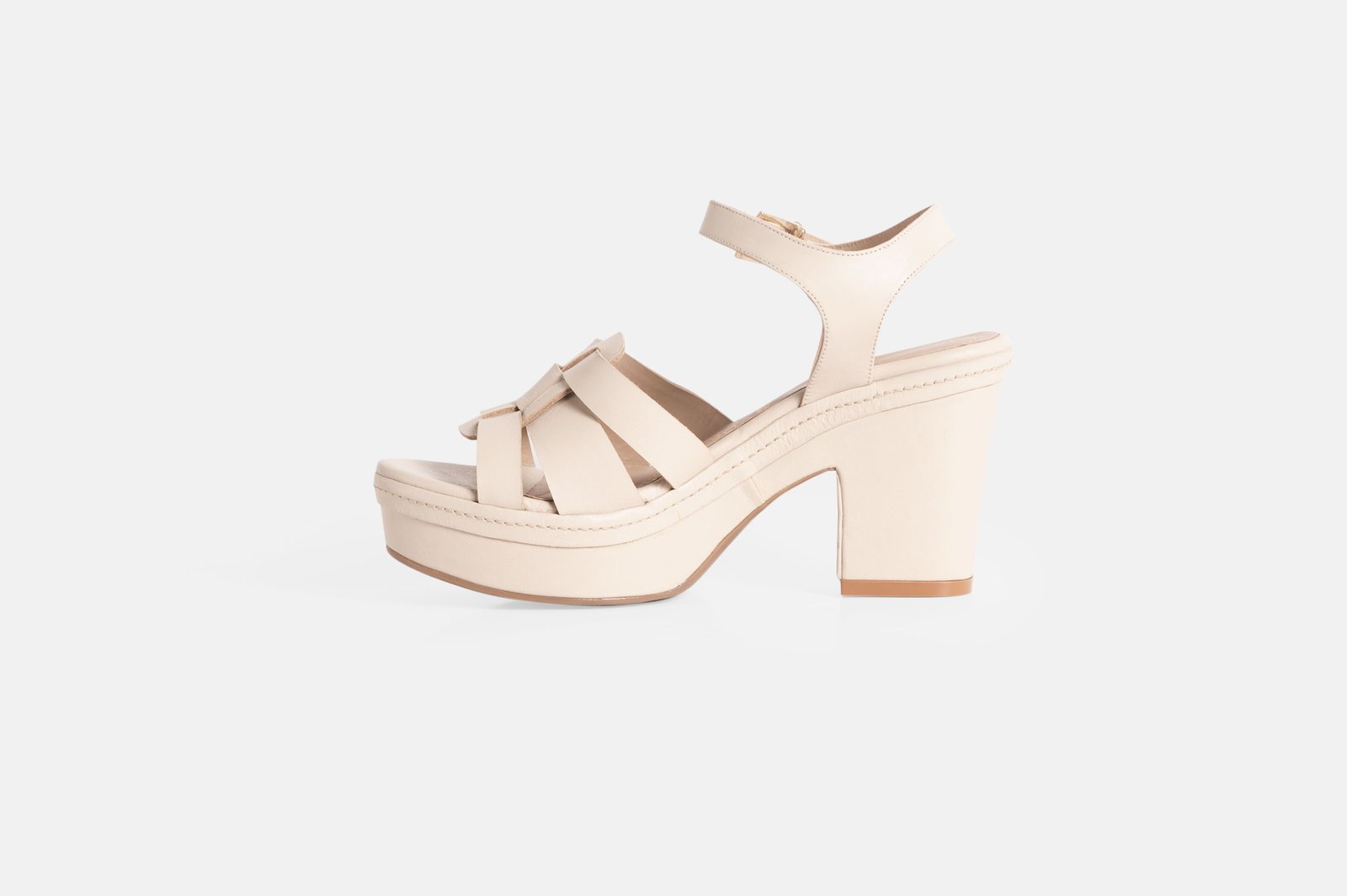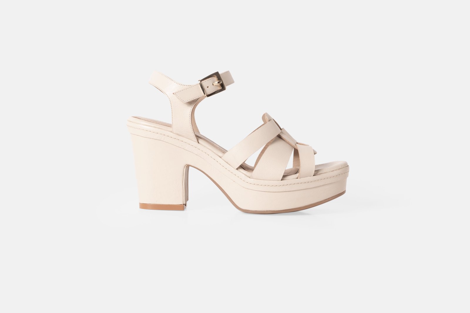 Sandalias con taco de mujer fabricadas en cuero crust color hueso. Interior con forro de badana premium para mayor confort. Poseen una altura de 10 cm y una plataforma de 5 cm con textura artesanal. Ajuste de pulsera con hebilla dorada y suela de alta durabilidad.