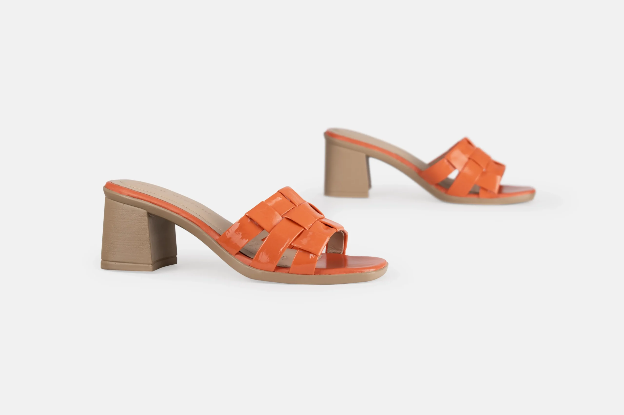 Mi Sandalia tacón para mujer modelo SARA en color naranja, hecho en cuero genuino artesanal.