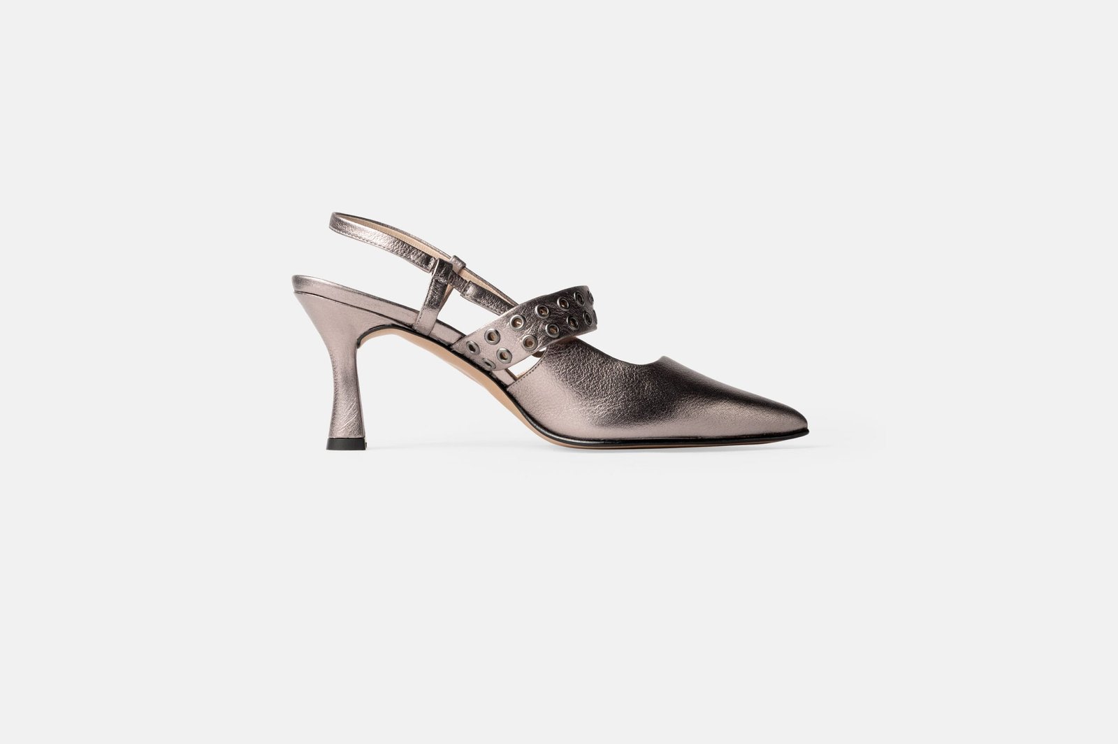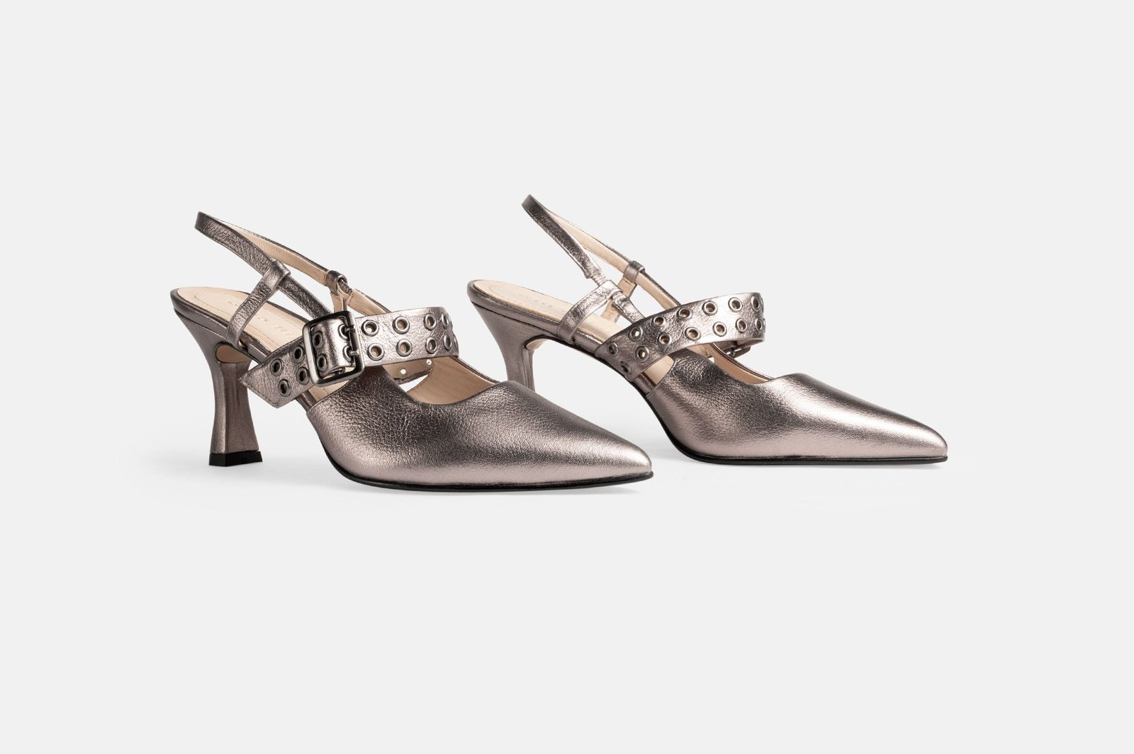 Exclusivo zapato de tacón tipo slingback en un deslumbrante color platino. Pensado en la mujer moderna y trabajadora, este par es el epítome de la sofisticación. Su acabado en cuero folia y la distintiva hebilla frontal añaden un toque de glamour en tu caminar, haciéndolos perfectos para una jornada en la oficina con un traje sastre o para brillar en un evento especial con tu vestido favorito. Te aseguramos ser el centro de todas las miradas y camina con la confianza que un calzado de cuero puede darte✨.