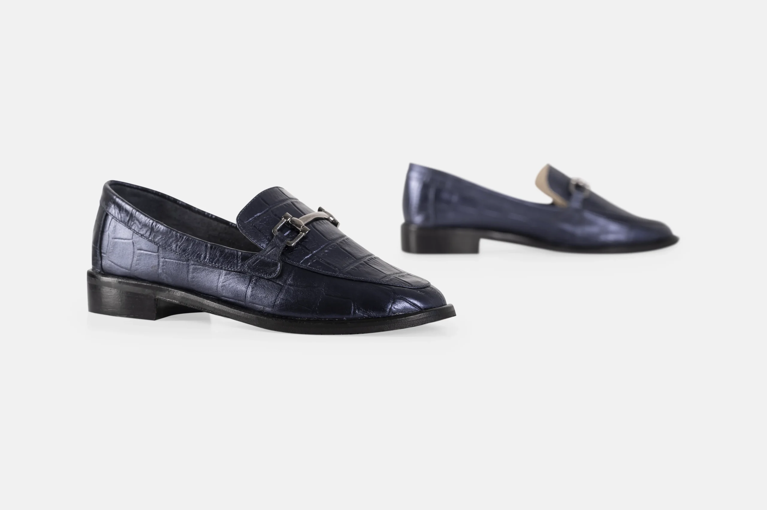 Zapato de mujer de cuero genuino en Croco azul metalizado. Son hechas en nuestra fábrica con la mejor tecnología disponible, garantizando un control de total calidad.
